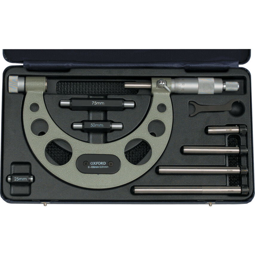 Oxford sokoldalú mikrométer sorozat cserélhető mérőcsapokkal, finom racsnival és rögzítőkarral. Fa tárolódobozban, beállító etalonokkal. Erős és stabil öntöttvas keret, mely a könnyebb súly érdekében ki van könnyítve.