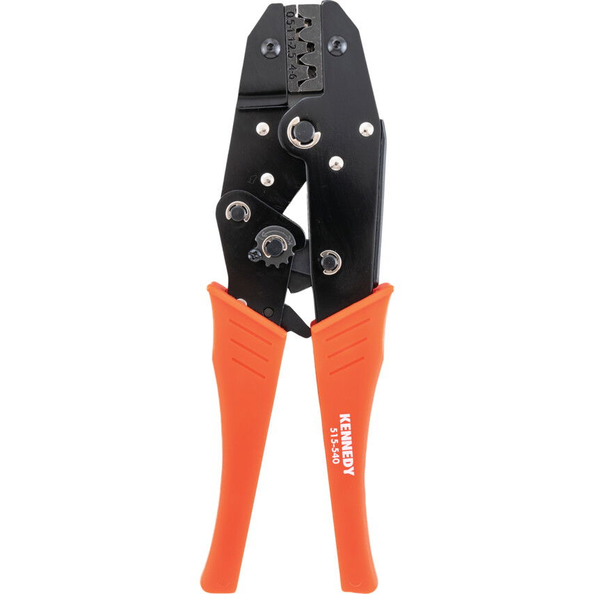 Saruzó fogó reteszelt préskerettel és állítható présnyomással szigeteletlen kábelsarukhoz. Szénacél pofák feketített kivitelben, PVC markolat.