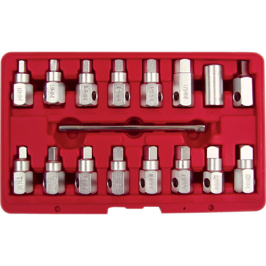 Kiváló minőségű, 3/8"-os csatlakozású dugókulcsok teljes készlete olajleeresztő csavarokhoz, csavarhajtó karral. Szatén felületű króm-vanádium ötvözetből készült. Tartalom: négyszögdugókulcs: 7mm, 8mm (5/16"), 9mm, (3/8"), 10mm, 11mm, 12mm és 13mm; négyszög-anya 10mm; dugókulcs 8, 9, 10, 12, 14, és 17mm; háromszögletű csavar 10mm; csavar hajtókar.