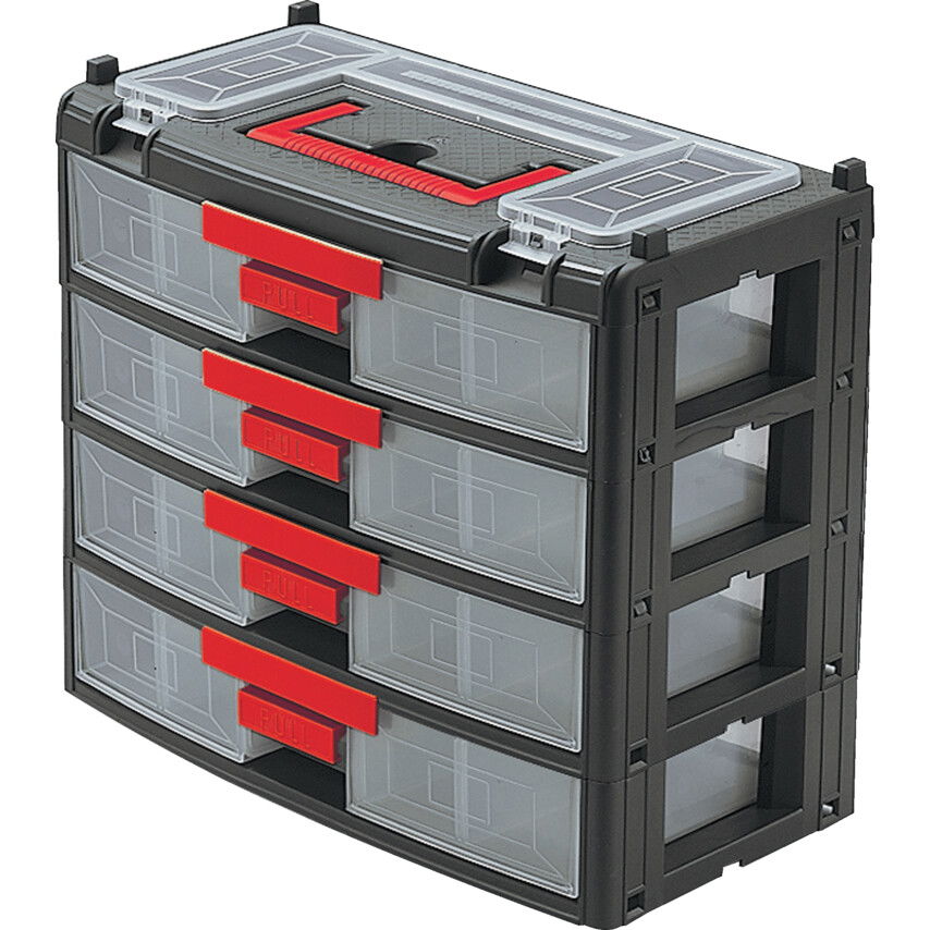 Erős, ütésálló polipropilénből készült, átlátszó fiókokkal. Három rekeszes felső tároló átlátszó fedéllel és műanyag kampós csattal. Szállítás során rögzíthető fiókok, mindegyik három áthelyezhető elosztólappal. Elrejthető hordózófül és rögzítőcsapok több szekrény egymásra helyezésének érdekében.