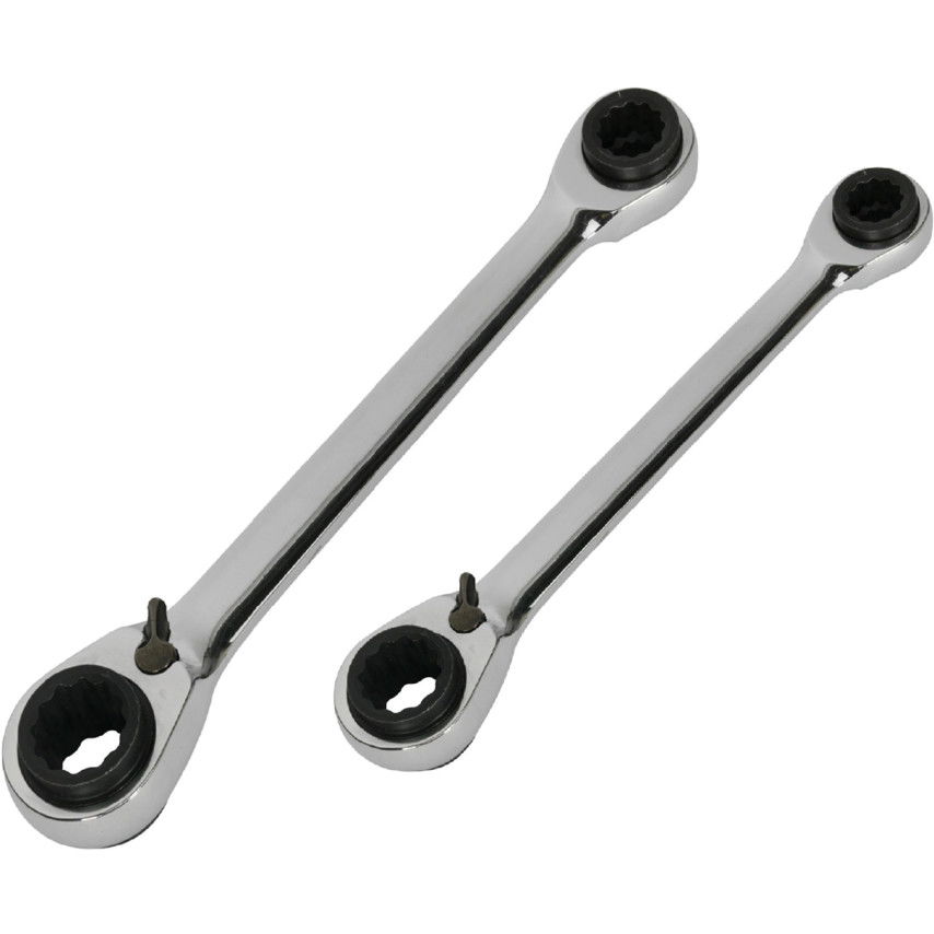 Kétvégű racsnis csavarkulcsok, egyenként 12 féle csavarmérethez. Ezek a csavarkulcsok egyaránt használhatók mm, hüvelyk és E-TORX méretezésű csavarokhoz, helyet takarítva meg a szerszámosládában. A 72 fogú racsnis kart elegendő csupán 5° -kal elforgatni használat közben, így ideális szűk helyeken történő használathoz. A kulcsok kiváló minőségű króm-vanádium acélötvözetből készülnek, tükörfényű felülettel, mely meggátolja az olaj és kosz rátapadását a kulcsra.