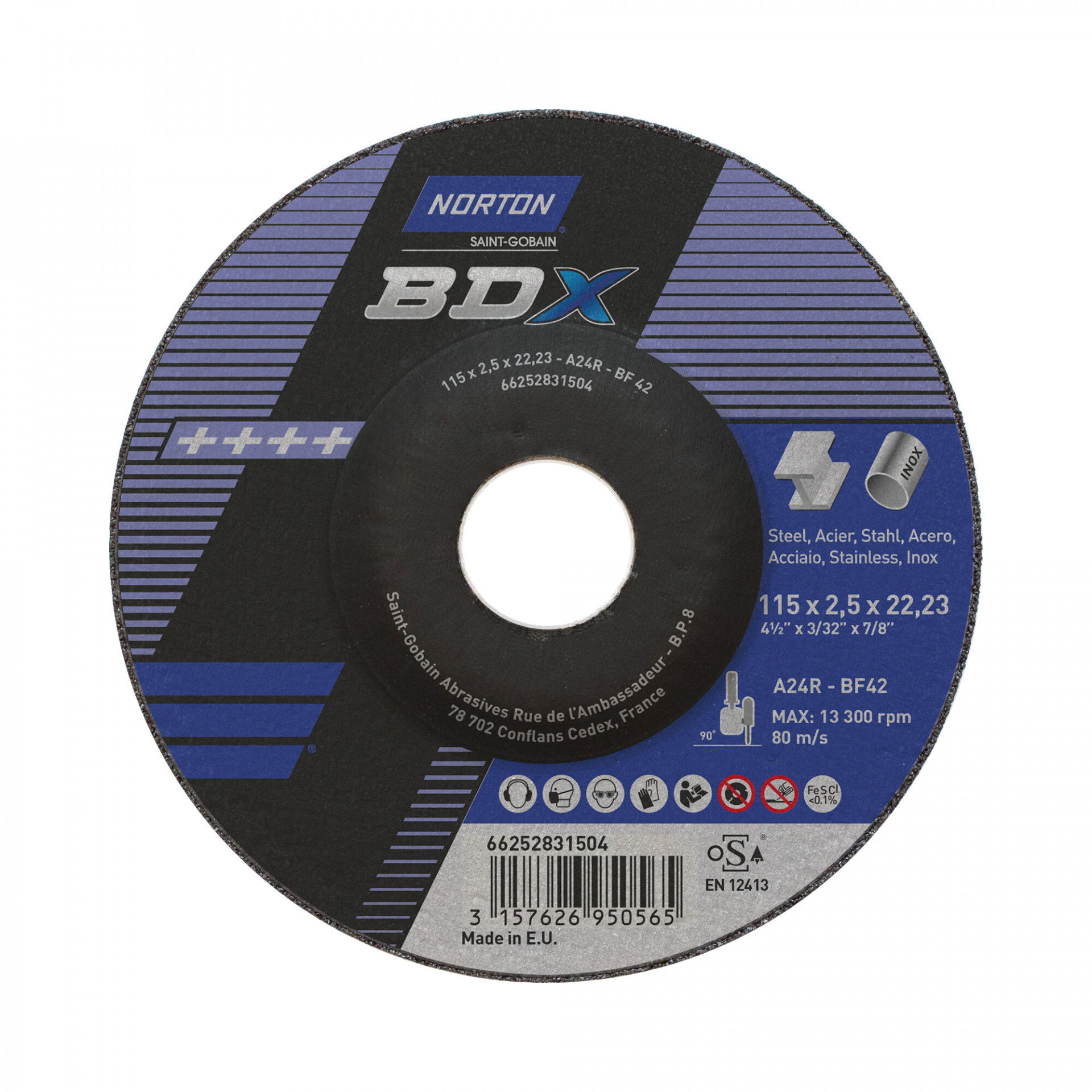 A Norton BDX fém-inox sorozat rendkívül vékony vágókorongokat kínál acél- és rozsdamentes acél széles választékához. A Norton BDX a költséghatékony vágókorongok szabványát állította be, amelyek hosszú élettartamot és gyorsabb fém eltávolítást biztosítanak az éles szilícium-karbid szemcséknek köszönhetően. Max.vágási sebesség : 80 m/s. Vas, kén és klór mentes. Nincs szennyeződés. Kevesebb rezgés.