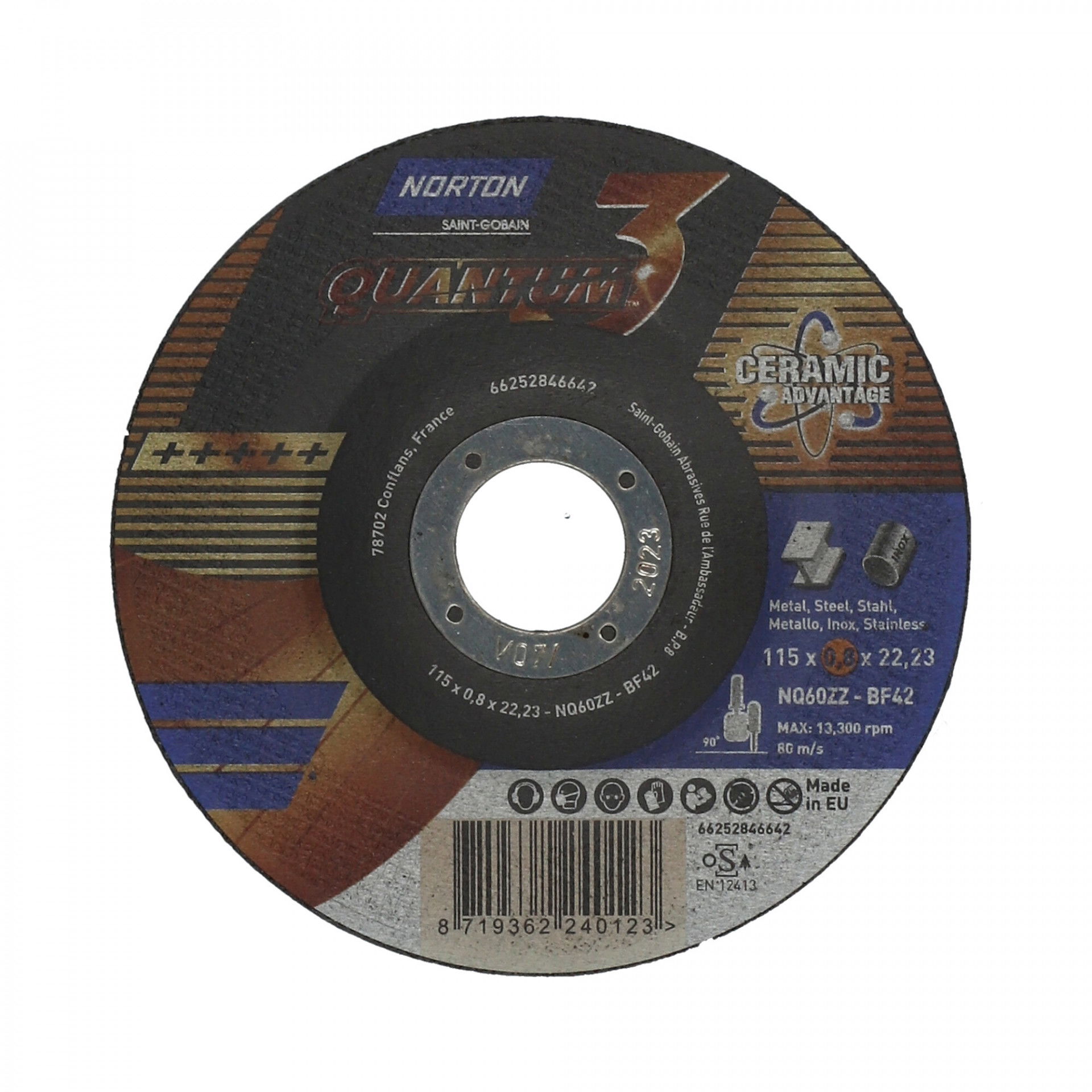 A Norton Quantum fém-inox vágókorong jellemzői a rendkívül gyors vágás, magas élettartam és kitűnő vágóképesség. Innovatív, kerámia vágókorongok. A legújabb fejlesztés, a legnagyobb sebesség és a legnagyobb kopásállóság a leghidegebb vágáshoz. Az innovatív Norton Quantum3 termékcsalád ultravékony kerámia vágókorongjai új szintre emelik a vágási teljesítményt a kényelem, az élettartam és a sebesség terén rendkívüli precizitással, gyorsasággal és pontossággal. A kerámia szemcsék adják ennek a korongnak egyedi karakterét, kategóriájában a legjobb teljesítményt nyújtva acélon és rozsdamentes acélon. Vágjon kevesebb rezgéssel, mivel a szuperéles kerámiaszemcsék alacsony nyomáson is folyamatosan dolgoznak, így a kezelő hosszabb ideig kényelmesebben vághat.