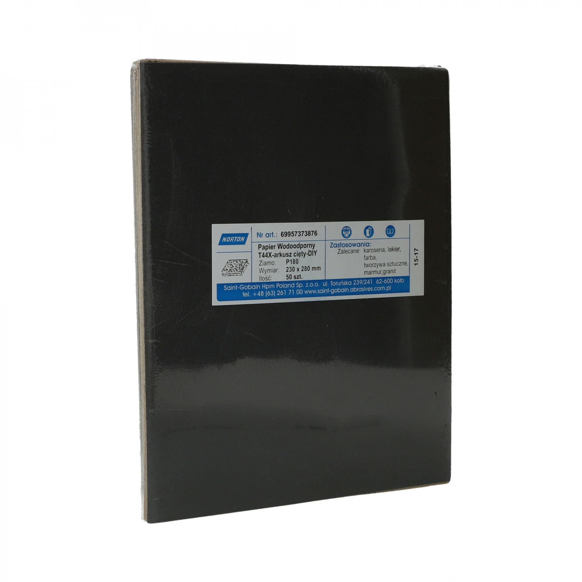 A Norton T44X vízálló csiszolópapír nagy teljesítményű szilíciumkarbid szemcsével nedves vagy száraz használatra alkalmas, nedves használat esetén tisztább felületet biztosít csiszolás közben. Gyors anyageltávolítás és simább és fényesebb felület elérése, ideális lakkozott felületeken való használatra és fémekhez. Festék- és lakkburkolatok, műanyagok, vas- és színesfémek csiszolására, polírozására is szolgál. Használható önmagában, csiszolótömbbel, kapcsos rögzítésű elektromos vagy akkumulátoros csiszológéppel.